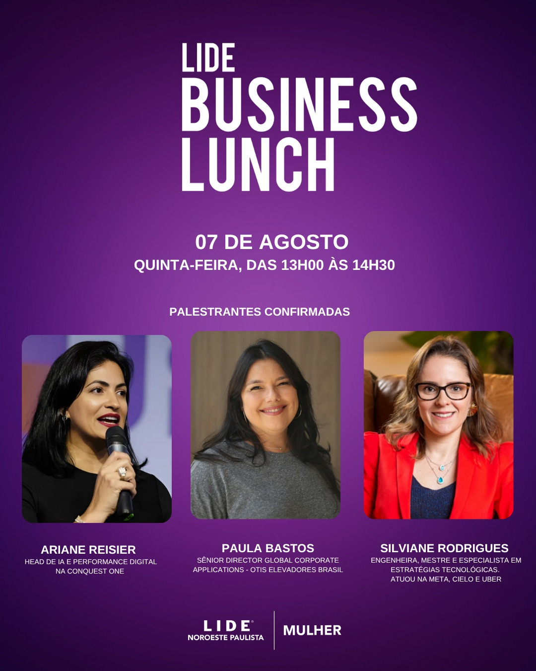 Filiada Lide Mulher pode ver e rever com exclusividade os eventos pelo APP do Lide. Para participar dos eventos, as filiadas devem confirmar presença pelo APP.